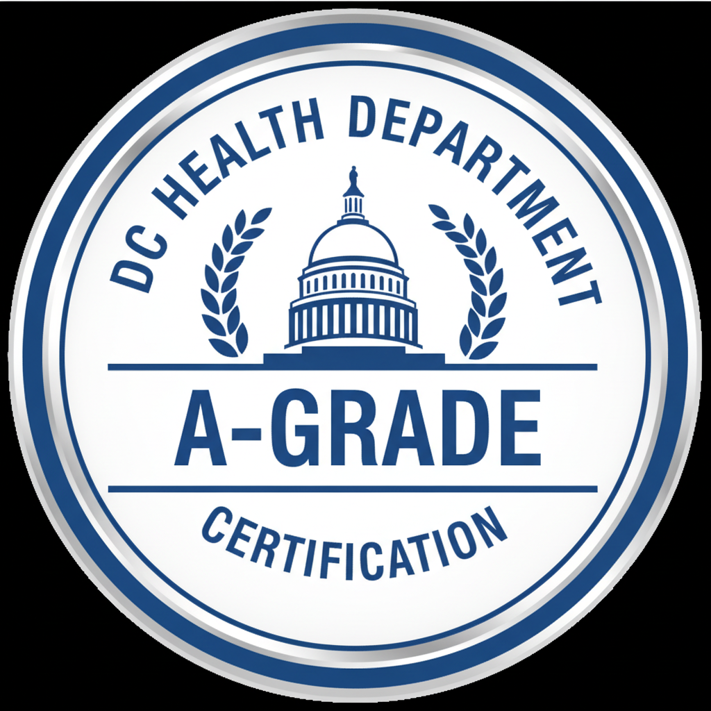 All certifications and licenses are current and displayed at our restaurant. We maintain the highest standards of food safety, cleanliness, and operational excellence as required by Washington DC regulations.